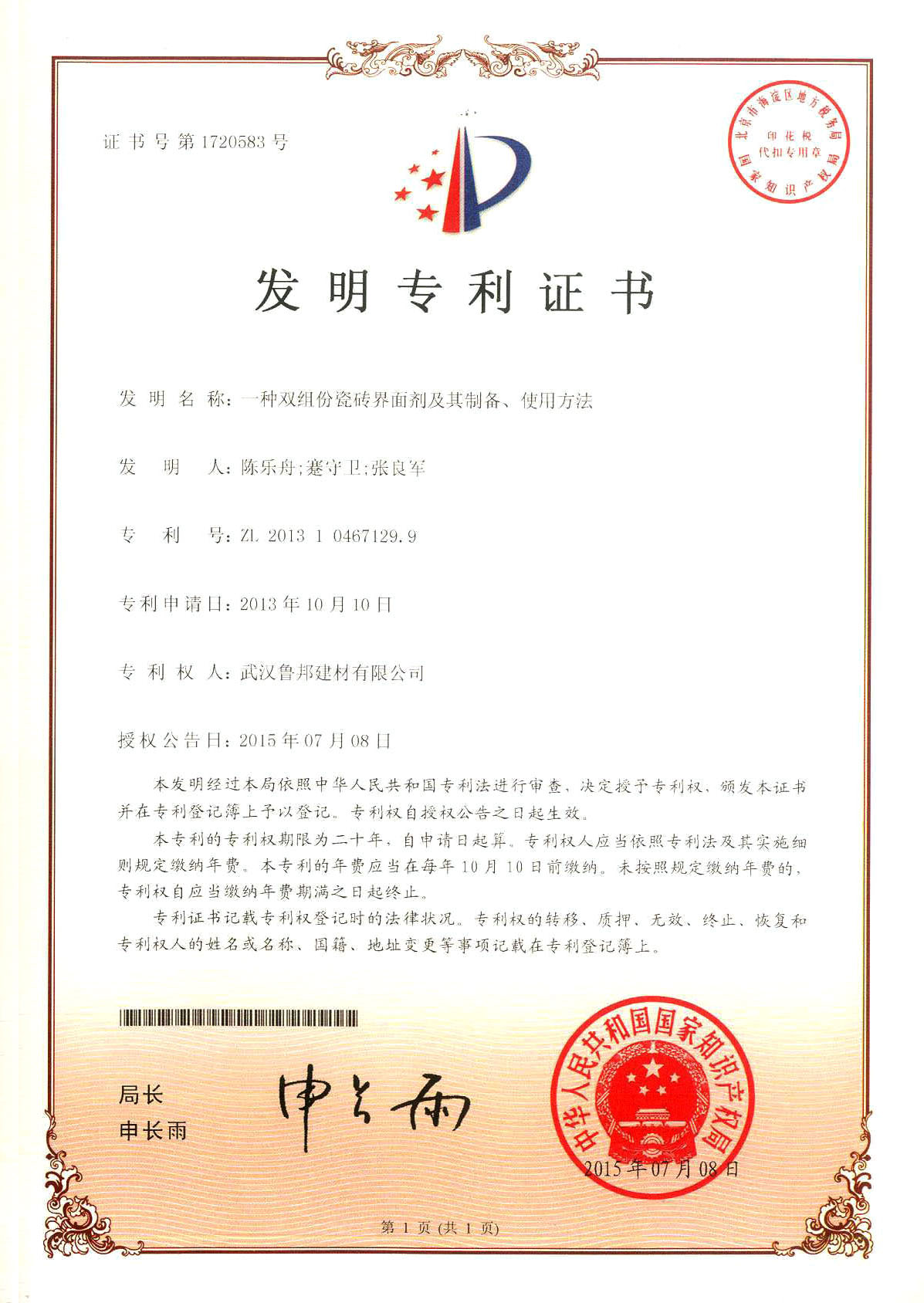 本產(chǎn)品是湖北魯邦建材股份有限公司技術(shù)研發(fā)中心開發(fā)的一種擁有國家發(fā)明專利(專利號:ZL2013104671299)的新型瓷磚粘結(jié)界面材料,由國際大品牌高分子聚合物及優(yōu)質(zhì)改性劑復(fù)合精制而成,能極大的釋放大部分玻化磚等高密度低吸水率磚與粘結(jié)材料之間的應(yīng)力,明顯的提高?;u等高密度低吸水率磚的粘結(jié)效果,不易空鼓,不易掉磚,直接解決大磚及高密度低吸水率磚粘貼難的問題。